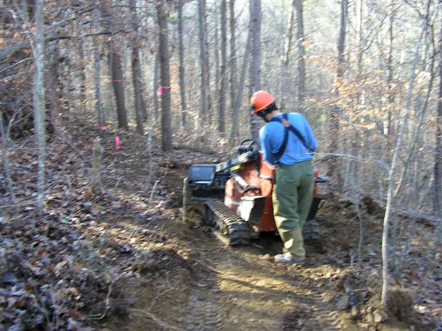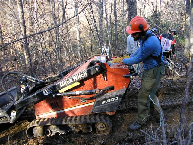 Rich Edwards of IMBA Trail Solutions uses a Ditch Witch to build trails at Walnut Creek Park during 3004 IMBA Trail Care Crew visit.